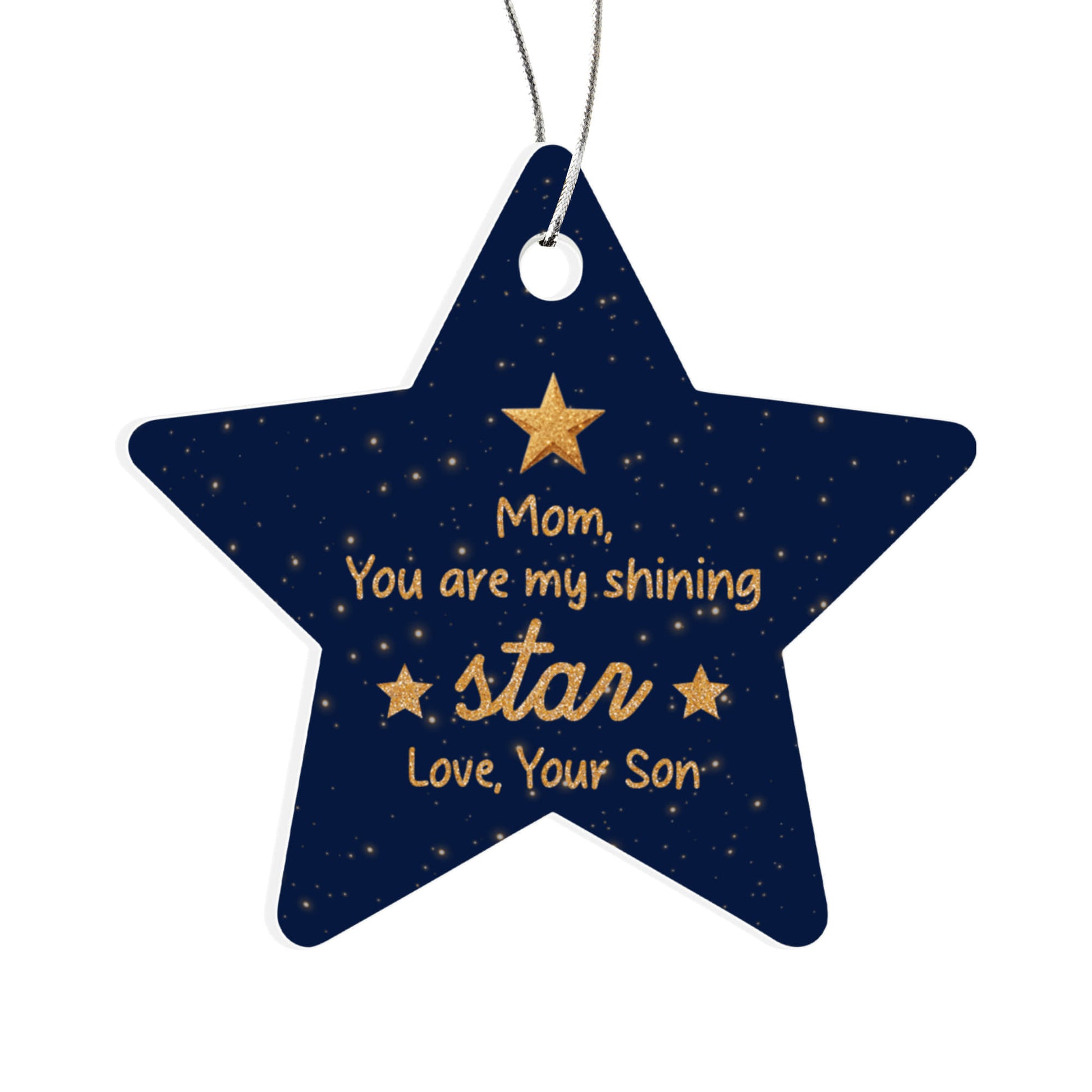 This isn't just an ornament; it's a message straight from a son's heart. It features the loving words, "Mom, You are my shining star. Love, Your Son," set against an elegant, deep blue starry sky. The "shining star" metaphor beautifully captures her role as a source of guidance, inspiration, and unwavering love in your life.