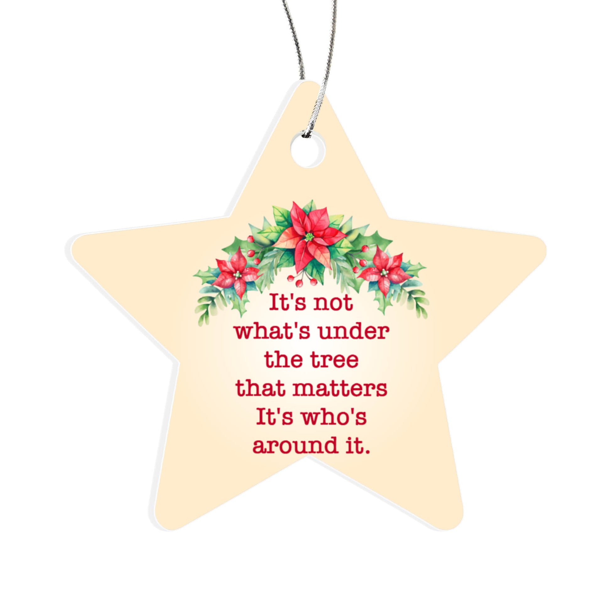 This elegant star-shaped ornament carries the classic and beloved message: "It's not what's under the tree that matters, It's who's around it." Beautifully designed with a delicate watercolor poinsettia garland, this keepsake is a tribute to the cherished moments that become our most treasured memories.