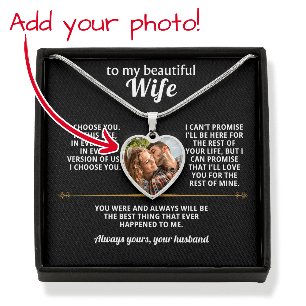 Message Reads: " To My Beautiful Wife, I choose you. In this life, in every life, in every version of us. I choose you. I can't promise I'll be here for the rest of your life, but I can promise that I'll love you for the rest of mine. You were and always will e the best thing that ever happened to me. Always yours, your husband.