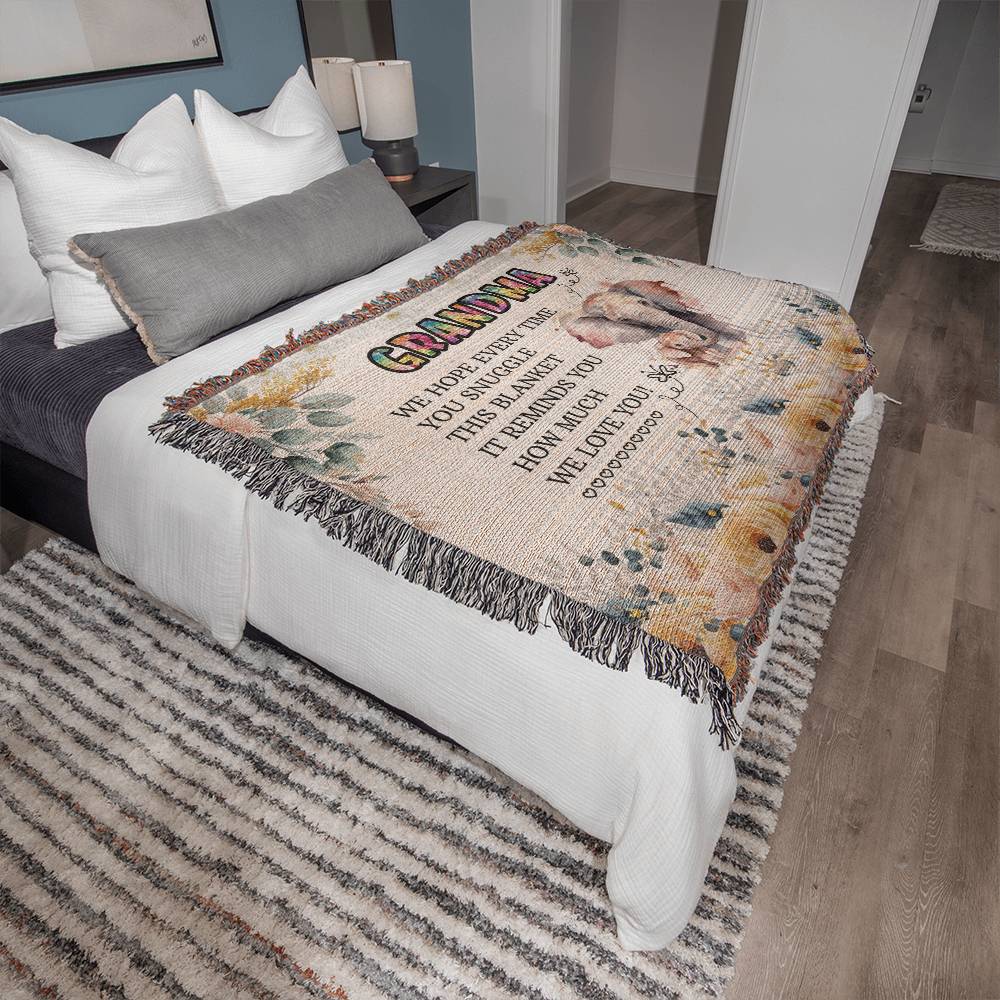 Imagine her delight as she reads the sweet, simple message from her favorite people: "GRANDMA, we hope every time you snuggle this blanket it reminds you how much we love you!" It’s a message designed to warm her heart every single day.For the woman whose love knows no bounds and whose hugs feel like home, this blanket is a tribute to her. It’s more than just a gift; it’s a warm embrace and a constant reminder of the love her family has for her, woven into every thread.